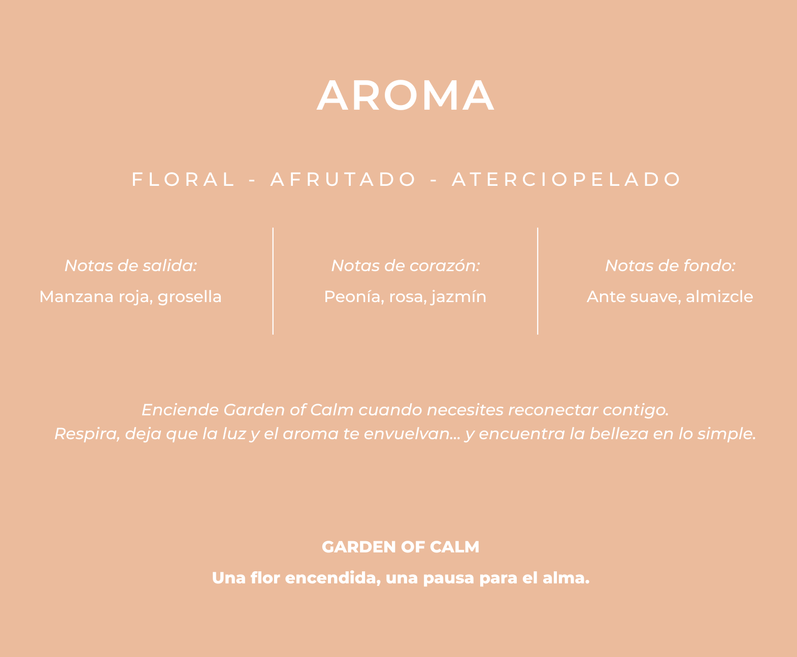 La vela aromática GARDEN OF CALM está inspirada en la serenidad de los instantes lentos y en la delicadeza de la flor de peonía recién abierta. Su fragancia combina notas florales y empolvadas que envuelven el espacio con una sensación de paz, elegancia y equilibrio.